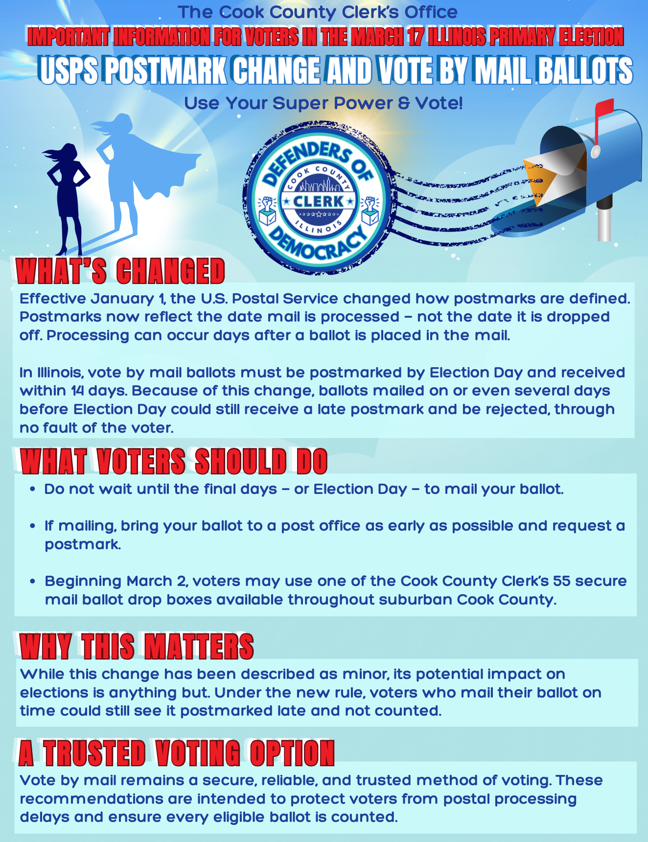 • Use one of the 55 secure mail ballot drop boxes that will be available throughout suburban Cook County beginning March 2, 2026.